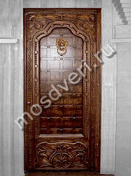 Парадная дверь в дом из массив дуба со стеклопакетом, ковкой и резьбой по дереву